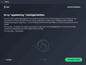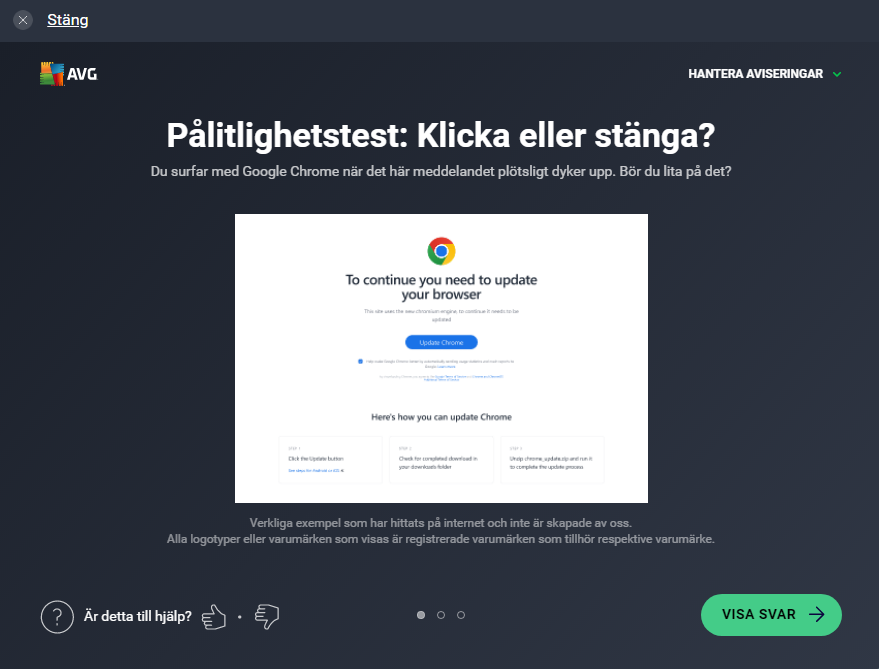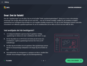 Den där ”uppdateringen” var inte äkta. Det var ett så kallat ”falskt uppdateringsbedrägeri”. Dessa ser ut som rutinmässiga aviseringar från Google, Microsoft eller till och med AVG – men de är faktiskt skadliga. Istället för att installera en legitim uppdatering lurar bedrägeriet dig att ladda ner och installera skadlig programvara. Hur gör de det? Bedragare kopierar betrodda varumärken och välkända uppdateringsfönster för att få meddelandena att se äkta ut så att man ska falla för dem.