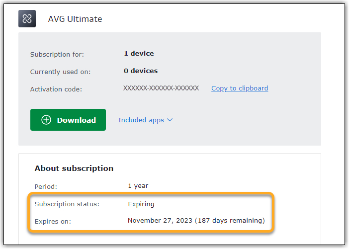 När prenumerationsförnyelsen avbryts ändras statusen till Expiring. Du kan fortsätta använda din betalda AVG-prenumeration tills utgångsdatumet visas bredvid Expires on. Efter detta datum kommer du antingen att förlora åtkomst eller så kommer programmet att bytas till gratisversionen såvida du inte avinstallerar det. Guide för det finns här.
